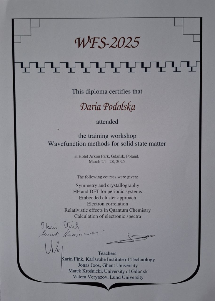 Студентка 3 курсу гр. ОФ-21 Дар’я Подольська з 24 по 28 березня 2025 року взяла участь у Конференції з новітніх методів обрахунку у спектроскопії та кристалографії, організованої Гданьским технічним університетом, Шведським університетом Lund University та спонсоровано організацією NAWA, яка відбувалася у Гданську (Польща).